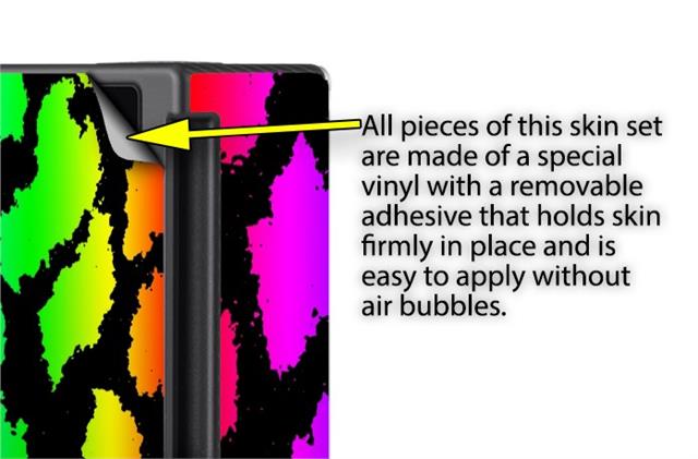 WraptoSkinz™ skins are superb photo quality designs and vibrant colors printed with special Eco-Friendly, fade resistant inks. Our skins are self-adhering flexible vinyl skins that helps prevent scratches. Made of composite, multi-layered commercial grade materials. The bottom layer is made with a special removable adhesive that is easily positioned and applied without air bubbles. We print your design on the bottom layer then bond a professional grade laminate over the entire skin adding a glossy protective finish.