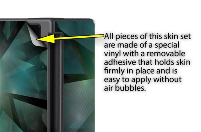 WraptoSkinz™ skins are superb photo quality designs and vibrant colors printed with special Eco-Friendly, fade resistant inks. Our skins are self-adhering flexible vinyl skins that helps prevent scratches. Made of composite, multi-layered commercial grade materials. The bottom layer is made with a special removable adhesive that is easily positioned and applied without air bubbles. We print your design on the bottom layer then bond a professional grade laminate over the entire skin adding a glossy protective finish.
