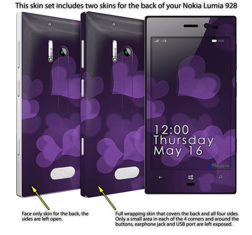 • Decal style vinyl skin covers front, back and side of Nokia Lumia 928 phone.