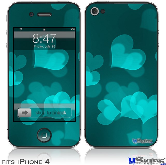 iPhone 4 Decal Style Vinyl Skin - Bokeh Hearts Neon Teal (DOES NOT fit newer iPhone 4S)