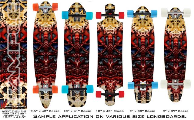 Our longboard skins are made so that one size fits boards up to 10” wide x 42” long. This means after applying the skin it you will trimming to fit you’re the shape of your board with a sharp utility knife.