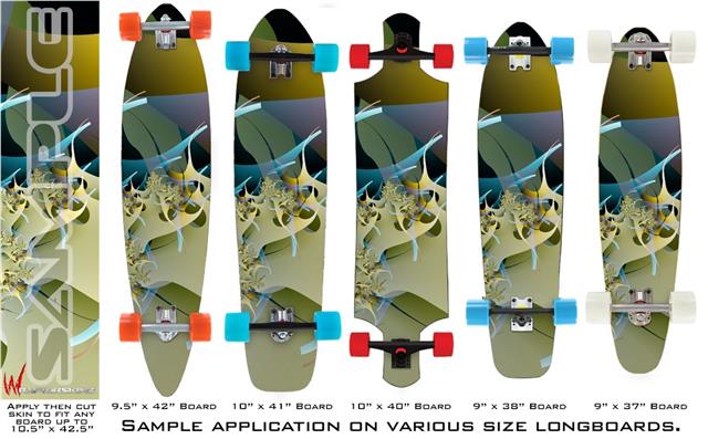 Our longboard skins are made so that one size fits boards up to 10” wide x 42” long. This means after applying the skin it you will trimming to fit you’re the shape of your board with a sharp utility knife.