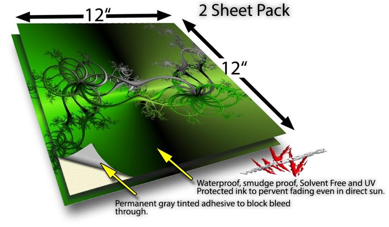 WraptoSkinz™ skin vinyl craft sheets are printed using superb photo quality designs and vibrant colors printed with special UV Protected fade resistant inks that last even in direct sun for years. Unlike other brands our inks are NOT solvent based. WraptorSkinz are a manufactured from professional grade 3mill vinyl. These sheets are waterproof, the designs will not run or smear even if submerged in water.